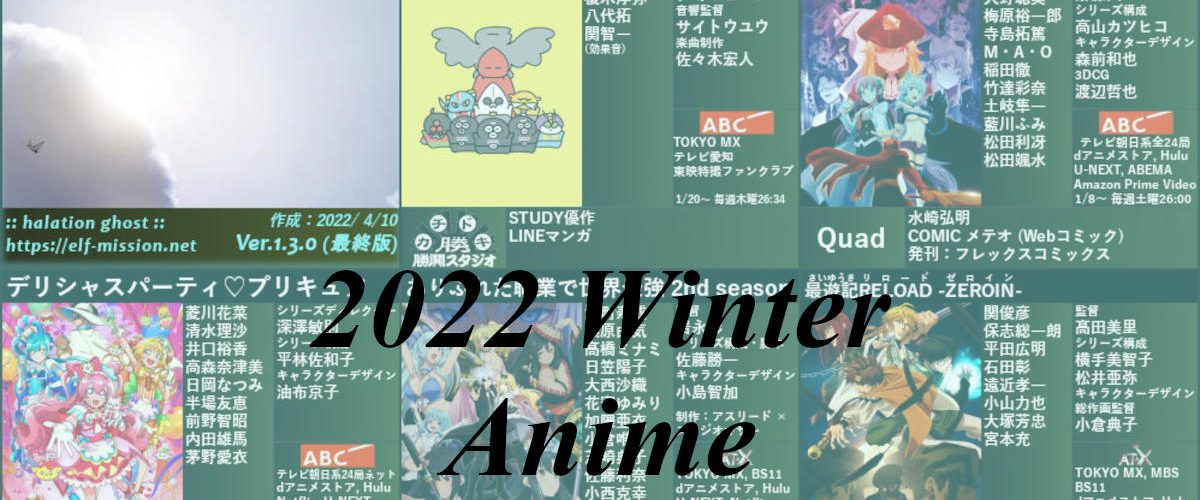 2022 年冬(1 月~ 3 月)放送開始予定のアニメ作品を一覧にまとめた画像を公開しています。一覧は左上から放送局、作品タイトルの 50 音順に並べています。