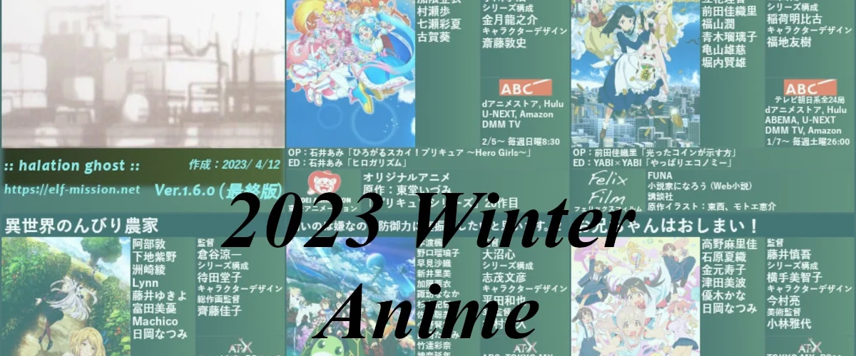 2023 年冬(1 月~ 3 月)放送開始予定のアニメ作品を一覧にまとめた画像を公開しています。一覧は左上から放送局、作品タイトルの 50 音順に並べています。