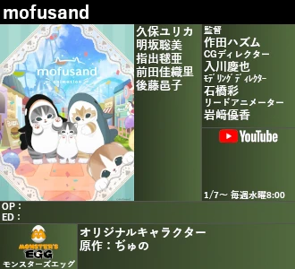 「転生したらドラゴンの卵だった」「カードファイト!! ヴァンガード Divinez 幻真星戦編」「地獄先生ぬ~べ~ (第2クール)」「有栖川煉ってホントは女なんだよね。」「ほっぺちゃん ~サン王国と黒ほっぺ団の秘密~」「青のミブロ 芹沢暗殺編 (第2期)」「Duel Masters LOST ~忘却の太陽~」「プリズム輪舞曲」「mofusand」「時光代理人 -LINK CLICK- 英都篇」を追加しました。