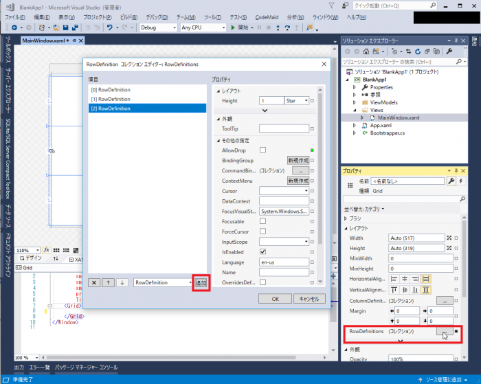 Grid を行方向に分割するには、[Grid のプロパティ] – [レイアウト(カテゴリ)] – [RowDefinitions] のボタンを Click して【RowDefinition コレクションエディタ】を開きます。