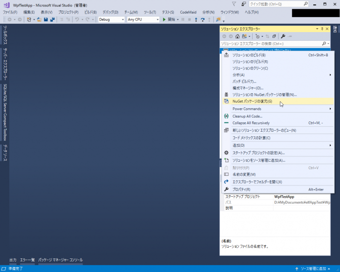 警告を消すには、episode: 2 でサンプルを開いたときと同じく、ソリューションのコンテキストメニューから [NuGetパッケージの復元] を選択すると、Prism のコンポーネントが復元されて警告も消えます。