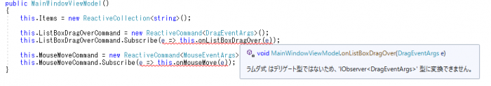 src. 5 のように Command の実行先に Delegate を指定した場合、fig. 5 のような『ラムダ式 はデリゲート型ではないため、型 ~ に変換できません。』と言うようなコンパイルエラーが出る場合があります。
