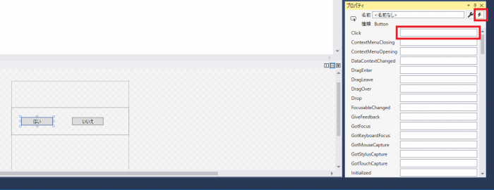 プロパティウィンドウからイベントハンドラを追加する方法も Windows Form と全く同じで、プロパティウィンドウ右上の稲妻アイコンをクリックしてイベント用の View に切り替え、追加したいイベント(ここでは Click)をダブルクリックすれば XAML とコードビハインドにイベントが自動的に追加されます。