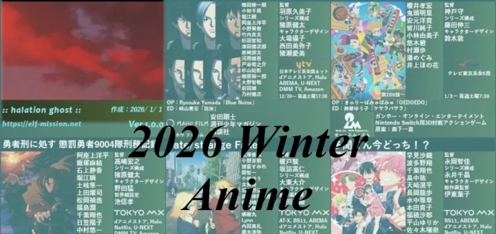 ↑上は見出し用の画像です。 一覧画像バージョン:Ver.1.0.0 2026 年冬(1 ~ 3 月)放送開始予定のテレビアニメ一覧画像はこの文章の下↓へ置いているのでもう少し下までスクロールしてください。又、更新情報の下に作品単体画像の一覧も置いています。スマホの人はそちらの方が見易いかもしれません。 誤字脱字、誤情報、新情報等あれば、本ページの一番最後にコメント頂けると助かります。...