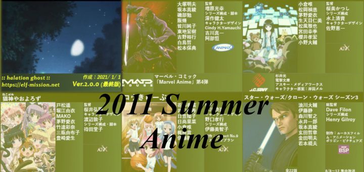 ↑上は見出し用の画像です。 2011 年夏(7 ~ 9 月)放送開始予定のテレビアニメ一覧画像はこの文章の下↓へ置いているのでもう少し下までスクロールしてください。又、更新情報の下に作品単体画像の一覧も置いています。スマホの人はそちらの方が見易いかもしれません。 誤字脱字、誤情報、新情報等あれば、本ページの一番最後にコメント頂けると助かります。 画像の転載時は自由ですが、転載元として...