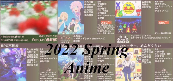 2022 年春(4 月~ 6 月)放送開始予定のアニメ作品を一覧にまとめた画像を公開しています。一覧は左上から放送局、作品タイトルの 50 音順に並べています。